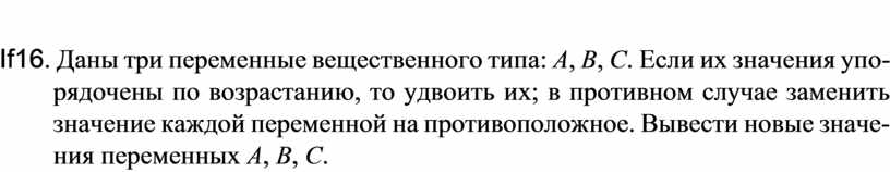 If16. Даны три переменные вещественного типа: A, B, C. Если их значения упо-рядочены по возрастанию, то удвоить их; в противном случае заменить значение каждой переменной на противоположное. Вывести новые значе-ния переменных A, B, C.