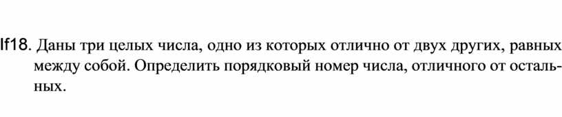 If18. Даны три целых числа, одно из которых отлично от двух других, равных между собой. Определить порядковый номер числа, отличного от осталь-ных.