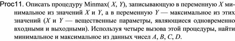 Proc11. Описать процедуру Minmax( X, Y), записывающую в переменную X ми-нимальное из значений X и Y, а в переменную Y — максимальное из этих значений (X и Y — вещественные параметры, являющиеся одновременно входными и выходными). Используя четыре вызова этой процедуры, найти минимальное и максимальное из данных чисел A, B, C, D.