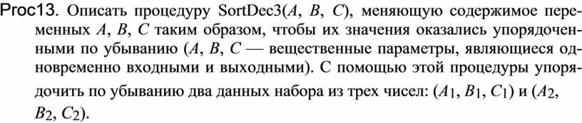 Proc13. Описать процедуру SortDec3(A, B, C), меняющую содержимое пере-менных A, B, C таким образом, чтобы их значения оказались упорядочен-ными по убыванию (A, B, C — вещественные параметры, являющиеся од-новременно входными и выходными). С помощью этой процедуры упоря-дочить по убыванию два данных набора из трех чисел: (A1, B1, C1) и (A2,