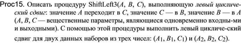 Proc15. Описать процедуру ShiftLeft3(A, B, C), выполняющую левый цикличе-ский сдвиг: значение A переходит в C, значение C — в B, значение B — в A (A, B, C — вещественные параметры, являющиеся одновременно входны-ми и выходными). С помощью этой процедуры выполнить левый цикличе-ский сдвиг для двух данных наборов из трех чисел: (A1, B1, C1) и (A2, B2, C2).