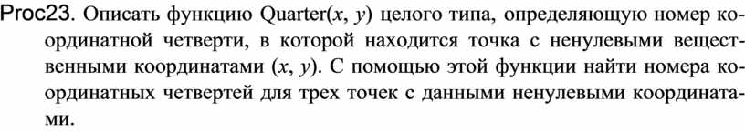 Proc23. Описать функцию Quarter(x, y) целого типа, определяющую номер ко-ординатной четверти, в которой находится точка с ненулевыми вещест-венными координатами (x, y). С помощью этой функции найти номера ко-ординатных четвертей для трех точек с данными ненулевыми координата-ми.
