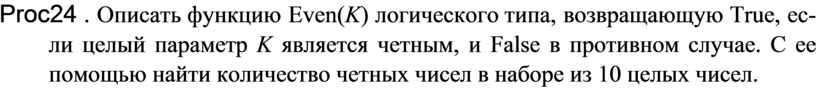 Proc24 . Описать функцию Even(K) логического типа, возвращающую True, ес-ли целый параметр K является четным, и False в противном случае. С ее помощью найти количество четных чисел в наборе из 10 целых чисел.