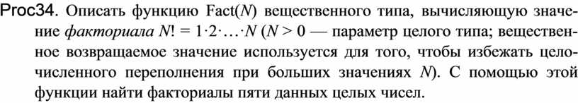 Proc34. Описать функцию Fact(N) вещественного типа, вычисляющую значе-ние факториала N! = 1·2·…·N (N > 0 — параметр целого типа; веществен-ное возвращаемое значение используется для того, чтобы избежать цело-численного переполнения при больших значениях N). С помощью этой функции найти факториалы пяти данных целых чисел.