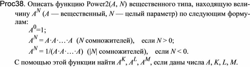 Proc38. Описать функцию Power2(A, N) вещественного типа, находящую вели-чину AN (A — вещественный, N — целый параметр) по следующим форму-лам: