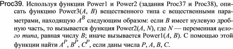 Proc39. Используя функции Power1 и Power2 (задания Proc37 и Proc38), опи-сать функцию Power3(A, B) вещественного типа с вещественными пара-метрами, находящую AB следующим образом: если B имеет нулевую дроб-ную часть, то вызывается функция Power2(A, N), где N — переменная цело-го типа, равная числу B; иначе вызывается Power1(A, B). С помощью этой функции найти AP, BP, CP, если даны числа P, A, B, C.