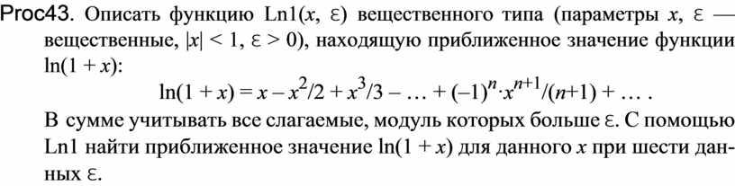 Proc43. Описать функцию Ln1(x, ε) вещественного типа (параметры x, ε — вещественные, |x| < 1, ε > 0), находящую приближенное значение функции ln(1 + x):