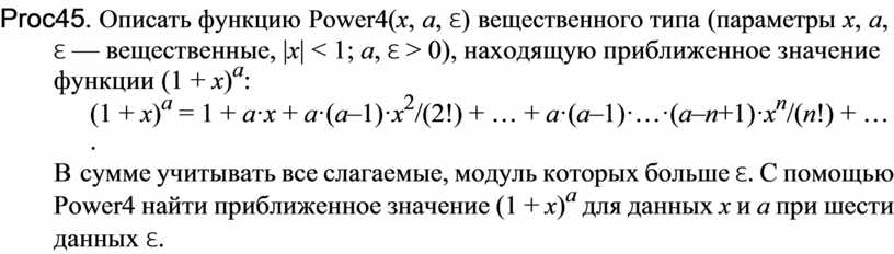 Proc45. Описать функцию Power4(x, a, ε) вещественного типа (параметры x, a,