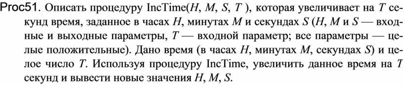 Proc51. Описать процедуру IncTime(H, M, S, T ), которая увеличивает на T се-кунд время, заданное в часах H, минутах M и секундах S (H, M и S — вход-ные и выходные параметры, T — входной параметр; все параметры — це-лые положительные). Дано время (в часах H, минутах M, секундах S) и це-лое число T. Используя процедуру IncTime, увеличить данное время на T секунд и вывести новые значения H, M, S.