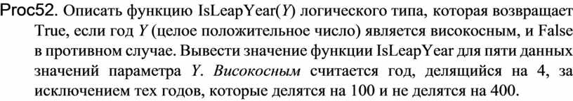 Proc52. Описать функцию IsLeapYear(Y) логического типа, которая возвращает True, если год Y (целое положительное число) является високосным, и False в противном случае. Вывести значение функции IsLeapYear для пяти данных значений параметра Y. Високосным считается год, делящийся на 4, за исключением тех годов, которые делятся на 100 и не делятся на 400.