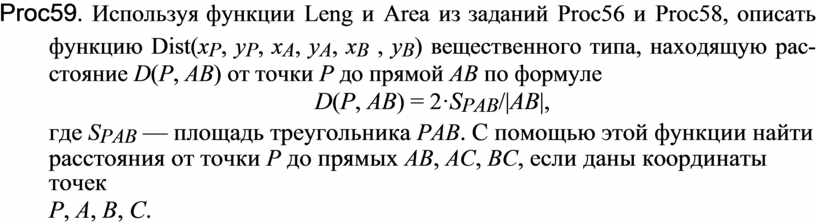 Proc59. Используя функции Leng и Area из заданий Proc56 и Proc58, описать функцию Dist(xP, yP, xA, yA, xB , yB) вещественного типа, находящую рас-стояние D(P, AB) от точки P до прямой AB по формуле