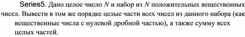 Series5. Дано целое число N и набор из N положительных вещественных чисел. Вывести в том же порядке целые части всех чисел из данного набора (как