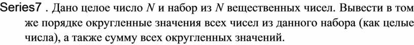 Series7 . Дано целое число N и набор из N вещественных чисел. Вывести в том же порядке округленные значения всех чисел из данного набора (как целые числа), а также сумму всех округленных значений.