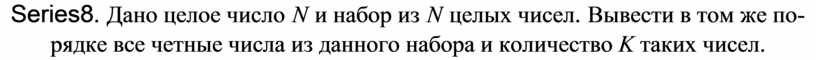Series8. Дано целое число N и набор из N целых чисел. Вывести в том же по-рядке все четные числа из данного набора и количество K таких чисел.
