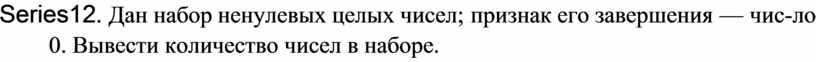 Series12. Дан набор ненулевых целых чисел; признак его завершения — чис-ло 0. Вывести количество чисел в наборе.