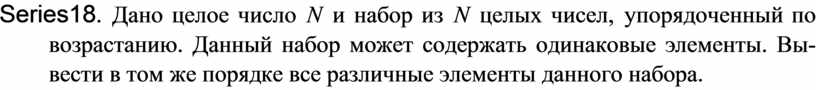 Series18. Дано целое число N и набор из N целых чисел, упорядоченный по возрастанию. Данный набор может содержать одинаковые элементы. Вы-вести в том же порядке все различные элементы данного набора.