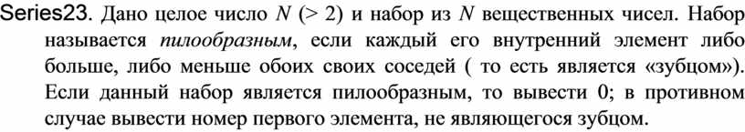 Series23. Дано целое число N (> 2) и набор из N вещественных чисел. Набор называется пилообразным, если каждый его внутренний элемент либо больше, либо меньше обоих своих соседей ( то есть является «зубцом»). Если данный набор является пилообразным, то вывести 0; в противном случае вывести номер первого элемента, не являющегося зубцом.