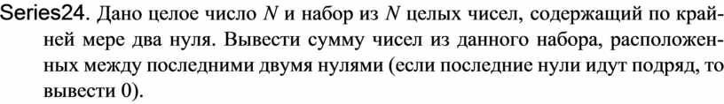 Series24. Дано целое число N и набор из N целых чисел, содержащий по край-ней мере два нуля. Вывести сумму чисел из данного набора, расположен-ных между последними двумя нулями (если последние нули идут подряд, то вывести 0).