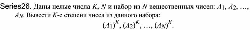 Series26. Даны целые числа K, N и набор из N вещественных чисел: A1, A2, …,