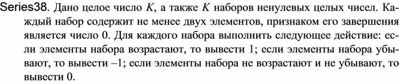 Series38. Дано целое число K, а также K наборов ненулевых целых чисел. Ка-ждый набор содержит не менее двух элементов, признаком его завершения является число 0. Для каждого набора выполнить следующее действие: ес-ли элементы набора возрастают, то вывести 1; если элементы набора убы-вают, то вывести –1; если элементы набора не возрастают и не убывают, то вывести 0.