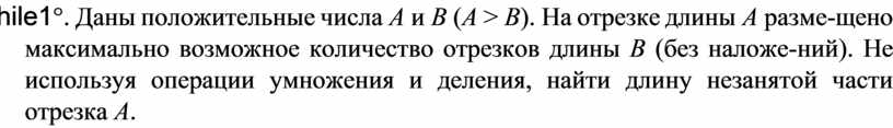While1°. Даны положительные числа A и B (A > B). На отрезке длины A разме-щено максимально возможное количество отрезков длины B (без наложе-ний). Не используя операции умножения и деления, найти длину незанятой части отрезка A.