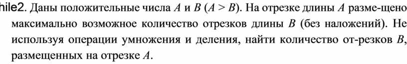 While2. Даны положительные числа A и B (A > B). На отрезке длины A разме-щено максимально возможное количество отрезков длины B (без наложений). Не используя операции умножения и деления, найти количество от-резков B, размещенных на отрезке A.