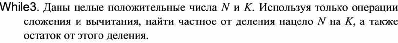 While3. Даны целые положительные числа N и K. Используя только операции сложения и вычитания, найти частное от деления нацело N на K, а также остаток от этого деления.