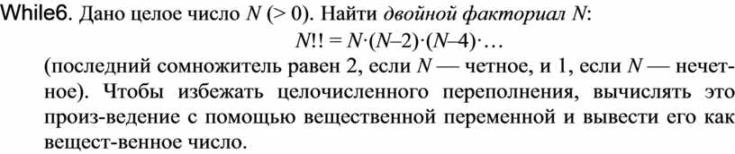 (последний сомножитель равен 2, если N — четное, и 1, если N — нечет-ное). Чтобы избежать целочисленного переполнения, вычислять это произ-ведение с помощью вещественной переменной и вывести его как вещест-венное число.