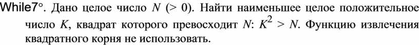 While7°. Дано целое число N (> 0). Найти наименьшее целое положительное число K, квадрат которого превосходит N: K2 > N. Функцию извлечения квадратного корня не использовать.
