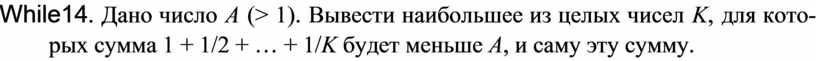 While14. Дано число A (> 1). Вывести наибольшее из целых чисел K, для кото-рых сумма 1 + 1/2 + … + 1/K будет меньше A, и саму эту сумму.