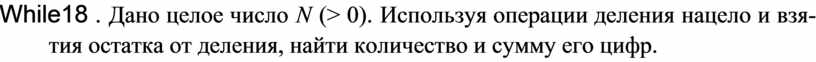 While18 . Дано целое число N (> 0). Используя операции деления нацело и взя-тия остатка от деления, найти количество и сумму его цифр.