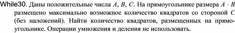 While30. Даны положительные числа A, B, C. На прямоугольнике размера A × B размещено максимально возможное количество квадратов со стороной C (без наложений). Найти количество квадратов, размещенных на прямо-угольнике. Операции умножения и деления не использовать.