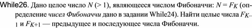 While26. Дано целое число N (> 1), являющееся числом Фибоначчи: N = FK (оп-ределение чисел Фибоначчи дано в задании While24). Найти целые числа FK–1 и FK+1 — предыдущее и последующее числа Фибоначчи.