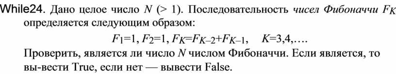 While24. Дано целое число N (> 1). Последовательность чисел Фибоначчи FK определяется следующим образом: