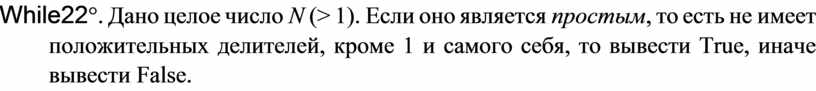 While22°. Дано целое число N (> 1). Если оно является простым, то есть не имеет положительных делителей, кроме 1 и самого себя, то вывести True, иначе вывести False.