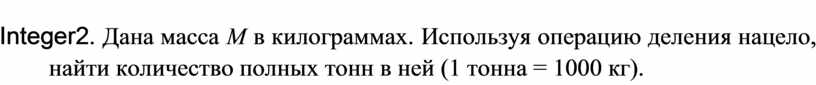 Integer2. Дана масса M в килограммах. Используя операцию деления нацело, найти количество полных тонн в ней (1 тонна = 1000 кг).