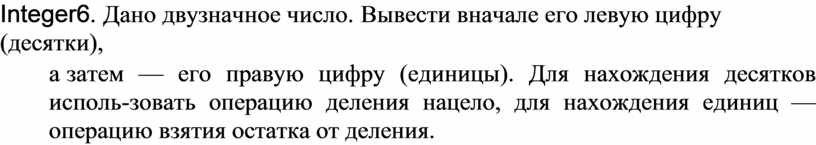 а затем — его правую цифру (единицы). Для нахождения десятков исполь-зовать операцию деления нацело, для нахождения единиц — операцию взятия остатка от деления.