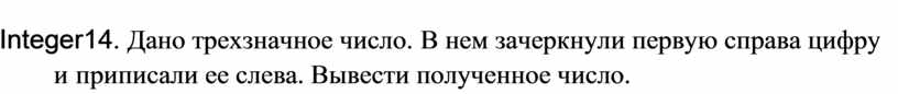 Integer14. Дано трехзначное число. В нем зачеркнули первую справа цифру и приписали ее слева. Вывести полученное число.