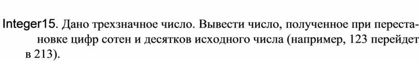 Integer15. Дано трехзначное число. Вывести число, полученное при переста-новке цифр сотен и десятков исходного числа (например, 123 перейдет