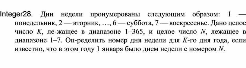 Integer28. Дни недели пронумерованы следующим образом: 1 — понедельник, 2 — вторник, …, 6 — суббота, 7 — воскресенье. Дано целое число K, ле-жащее в диапазоне 1–365, и целое число N, лежащее в диапазоне 1–7. Оп-ределить номер дня недели для K-го дня года, если известно, что в этом году 1 января было днем недели с номером N.
