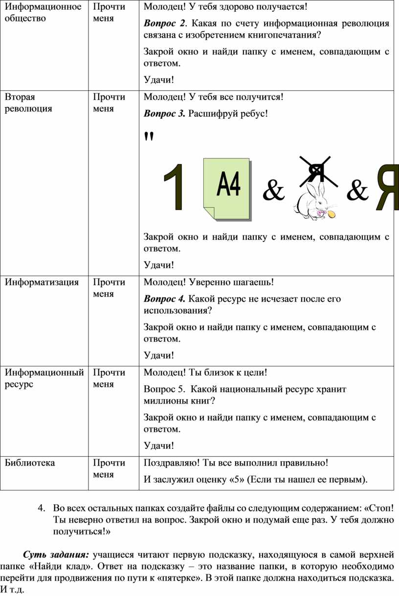 Суть задания: учащиеся читают первую подсказку, находящуюся в самой верхней папке «Найди клад». Ответ на подсказку – это название папки, в которую необходимо перейти для продвижения по пути к «пятерке». В этой папке должна находиться подсказка. И т.д.