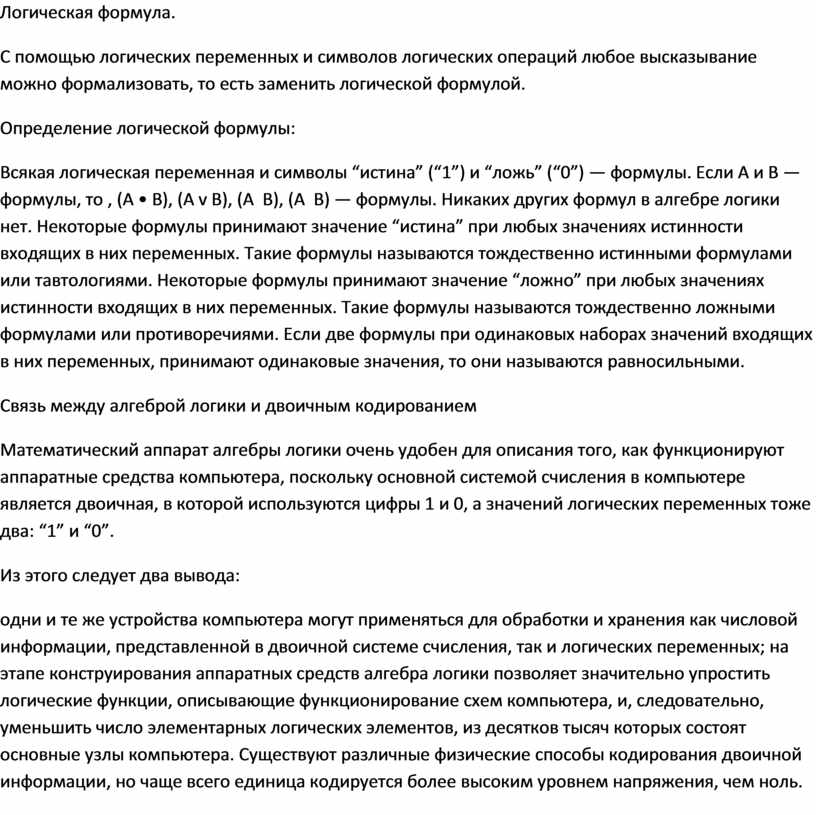 Всякая логическая переменная и символы “истина” (“1”) и “ложь” (“0”) — формулы. Если А и В — формулы, то , (А • В), (А v В), (А B), (А В) — формулы. Никаких других формул в алгебре логики нет. Некоторые формулы принимают значение “истина” при любых значениях истинности входящих в них переменных. Такие формулы называются тождественно истинными формулами или тавтологиями. Некоторые формулы принимают значение “ложно” при любых значениях истинности входящих в них переменных. Такие формулы называются тождественно ложными формулами или противоречиями. Если две формулы при одинаковых наборах значений входящих в них переменных, принимают одинаковые значения, то они называются равносильными.
