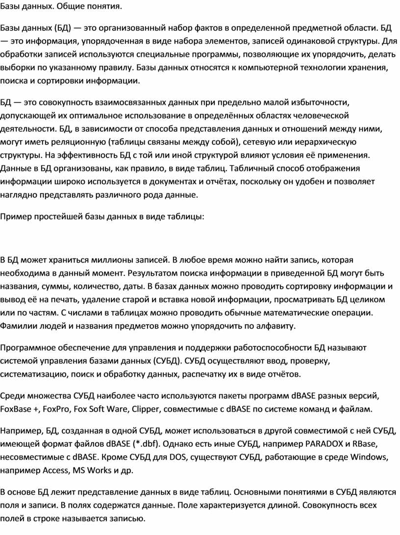 Базы данных (БД) — это организованный набор фактов в определенной предметной области. БД — это информация, упорядоченная в виде набора элементов, записей одинаковой структуры. Для обработки записей используются специальные программы, позволяющие их упорядочить, делать выборки по указанному правилу. Базы данных относятся к компьютерной технологии хранения, поиска и сортировки информации.
