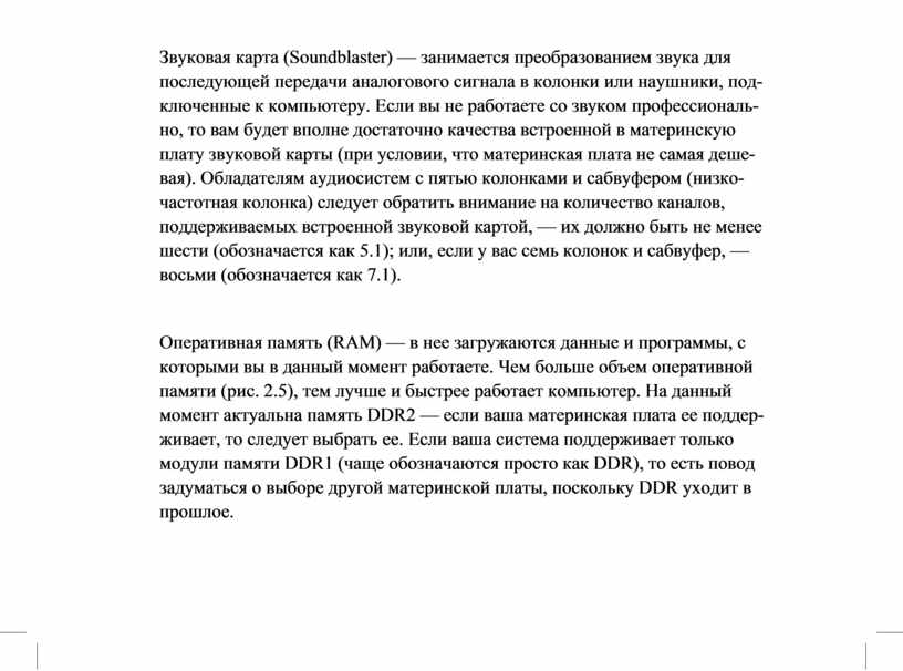 Звуковая карта (Soundblaster) — занимается преобразованием звука для последующей передачи аналогового сигнала в колонки или наушники, под-ключенные к компьютеру. Если вы не работаете со звуком профессиональ-но, то вам будет вполне достаточно качества встроенной в материнскую плату звуковой карты (при условии, что материнская плата не самая деше-вая). Обладателям аудиосистем с пятью колонками и сабвуфером (низко-частотная колонка) следует обратить внимание на количество каналов, поддерживаемых встроенной звуковой картой, — их должно быть не менее шести (обозначается как 5.1); или, если у вас семь колонок и сабвуфер, — восьми (обозначается как 7.1).