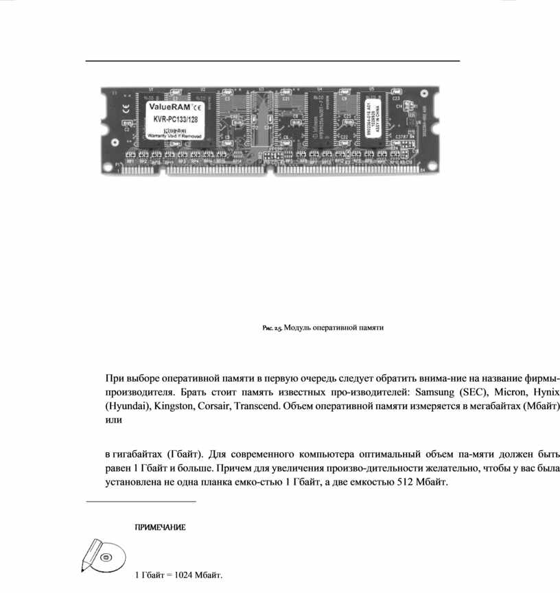 в гигабайтах (Гбайт). Для современного компьютера оптимальный объем па-мяти должен быть равен 1 Гбайт и больше. Причем для увеличения произво-дительности желательно, чтобы у вас была установлена не одна планка емко-стью 1 Гбайт, а две емкостью 512 Мбайт.