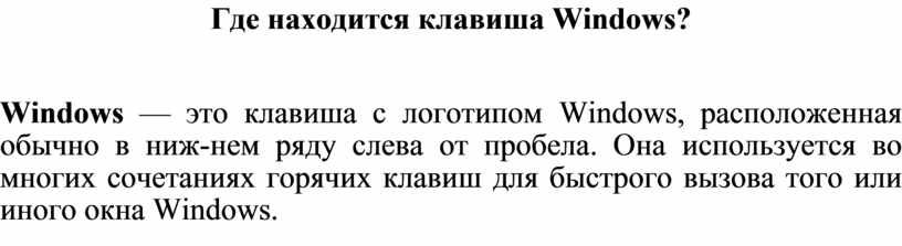 Windows — это клавиша с логотипом Windows, расположенная обычно в ниж-нем ряду слева от пробела. Она используется во многих сочетаниях горячих клавиш для быстрого вызова того или иного окна Windows.