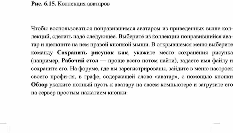Чтобы воспользоваться понравившимся аватаром из приведенных выше кол-лекций, сделать надо следующее. Выберите из коллекции понравившийся ава-тар и щелкните на нем правой кнопкой мыши. В открывшемся меню выберите команду Сохранить рисунок как, укажите место сохранения рисунка (например, Рабочий стол — проще всего потом найти), задаете имя файлу и сохраните его. На форуме, где вы зарегистрированы, зайдите в меню настроек своего профи-ля, в графе, содержащей слово «аватар», с помощью кнопки Обзор укажите полный пусть к аватару на своем компьютере и загрузите его на сервер простым нажатием кнопки.