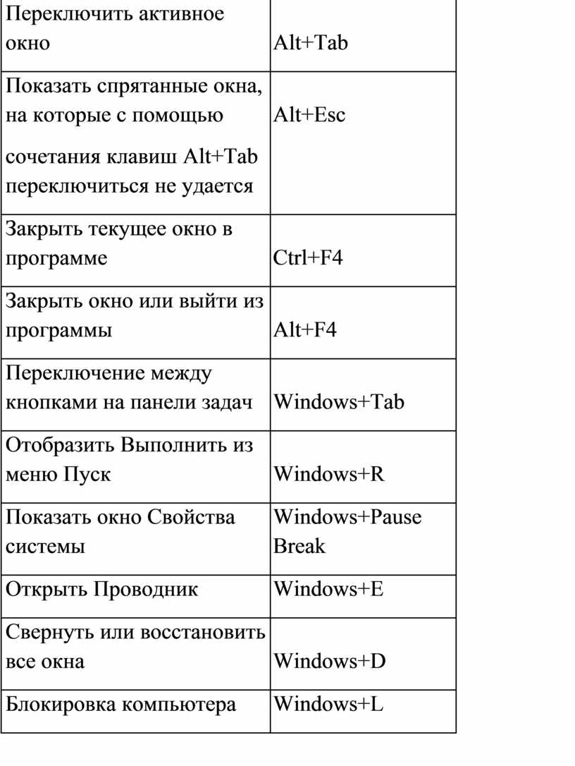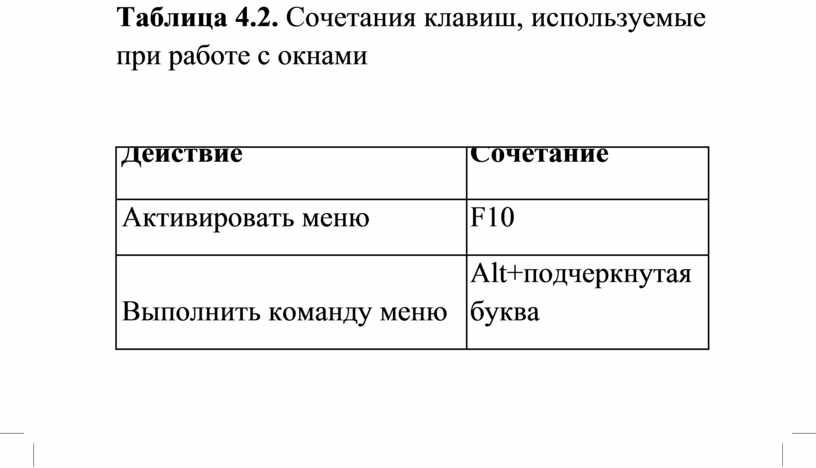 Таблица 4.2. Сочетания клавиш, используемые при работе с окнами |