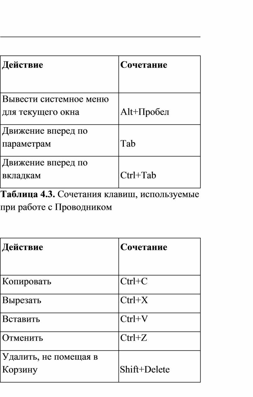 Ниже в таблицах приведен перечень наиболее употребляемых сочетаний кла-виш (табл. 4.1–4.3).