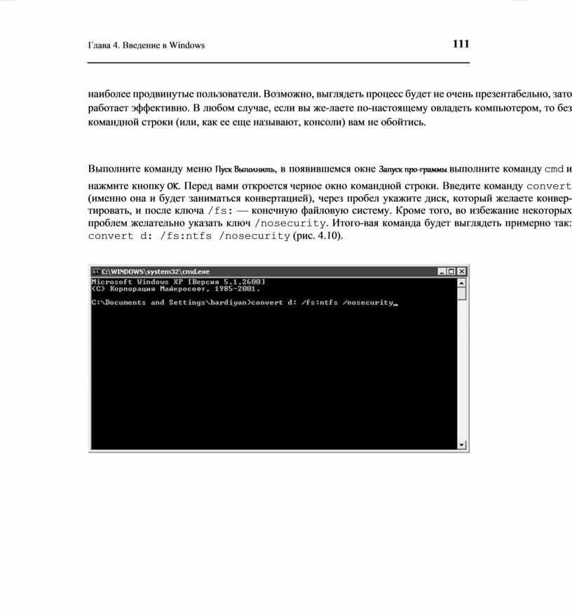Выполните команду меню Пуск Выполнить, в появившемся окне Запуск про-граммы выполните команду cmd и нажмите кнопку OK. Перед вами откроется черное окно командной строки. Введите команду convert (именно она и будет заниматься конвертацией), через пробел укажите диск, который желаете конвер-тировать, и после ключа /fs: — конечную файловую систему. Кроме того, во избежание некоторых проблем желательно указать ключ /nosecurity. Итого-вая команда будет выглядеть примерно так: convert d: /fs:ntfs /nosecurity (рис. 4.10).